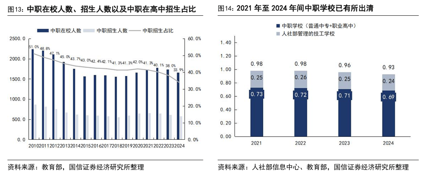 与职业教育总体旺盛的需求相比,中等职业教育近年来处于定位相对尴尬的结构性困境中。从职业教育体系来看,中等职业教育是基础环节,承担着将低技能从业者快速升级为中级技能从业者的任务;从教育环节来看,中等职业教育招录的主要人群仍是15-17岁的高中适龄人群,不可避免与普通高中进行生源竞争。2010年起的“普职分流”一方面尽量维持了中等职业教育的基本生源,但另一方面也加强了社会认知惯性,中等职业被视为中考分流下的“次选”。2010-2020年间,中职招生占比已从51%下滑至了41%;伴随2023年起普通高中加速扩招,更进一步下滑到34%。供给端中职学校也有所出清,2021-2024年间,已合计净关约500所。中等职业教育在职教体系中起到的基础作用或过渡作用有待加强。高考结束后,普通高中毕业生也可以分流进入到高等职业教育学校(大专、职业本科等)进行学习,普通高中保留了在后续继续接受高等普通教育、或转向高等职业教育的选择权;相较选择中等职业教育更具优势。