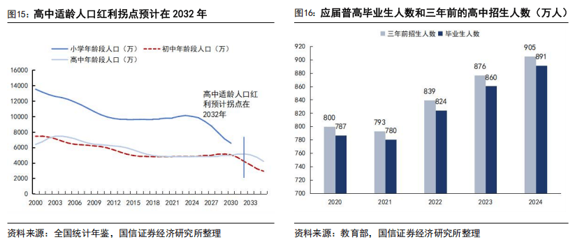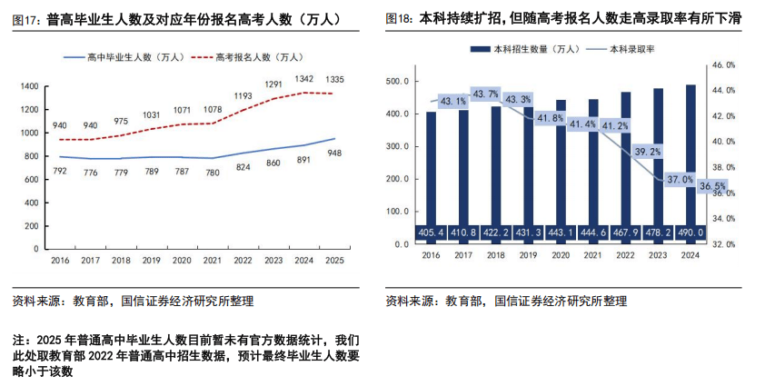 中职仍具备坚实的客观需求,预计后续选择职业教育与普通教育的学生规模将在市场化选择下重新寻找均衡。从国家技能人才培养体系与产业现实需求来看,中职所承担的基础技能托底与升学就业过渡衔接功能,短期内无法被普通高中完全替代,其底层社会与产业需求长期存在。一方面,我国产业结构中仍存在大量对中级技能劳动者的刚性需求,中职承担着将低技能适龄劳动力快速转化为产业实用人才的关键职能;另一方面,并非所有 15-17 岁青少年均适配普通高中的学术型培养路径,中职为这类群体提供了早期技能立身、差异化成才的通道,是维持教育体系多样性的重要组成。结合人口与升学数据可以进一步印证:近年高中招生规模与应届毕业人数出现差值,2025 年高中毕业生人数持续增长的同时,高考报名人数在高位已出现小幅下滑,意味着部分学生在普高体系中升学意愿、适配度偏低,这类群体或在后续重新回流至职业教育赛道,我们分析中职的结构性需求并不会因普高扩招而消失。