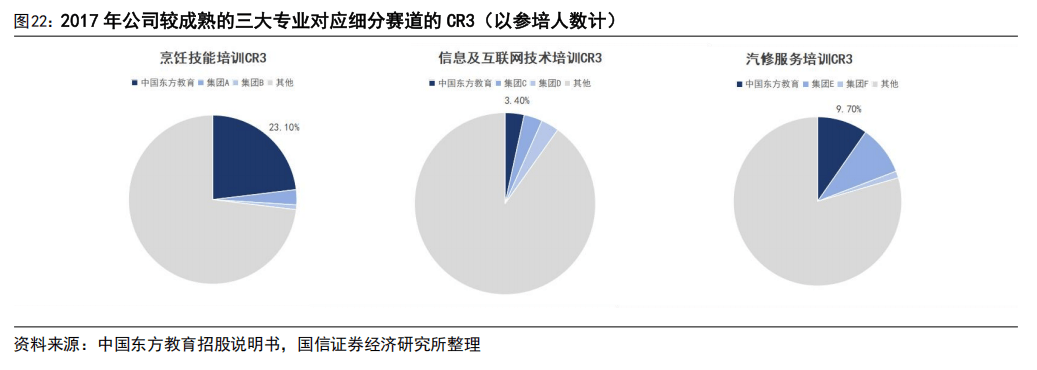 各细分专业均形成头部龙头,中国东方教育在烹饪技能、IT 技术及汽修服务三方面均较领先。集中度因赛道特性差异显著,烹饪赛道集中度最高,汽修赛道集中度次之,最后 IT 赛道集中度相对偏低。我们分析集中度差异核心源于两大维度:一是烹饪技能标准化易复制,汽修、IT 因技术、车型迭代快标准化难度更大;二是餐饮就业需求标准化,无论是高端酒店、连锁餐饮还是本地餐馆,对基础烹饪技能的需求一致性较高,适配头部机构规模化人才输出模式,便于头部机构与全国餐饮企业建立长期合作,巩固市场地位。