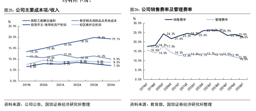 公司持续推进职教产业园建设,从成本与招生两端显著优化经营效率。成本端,产业园以自有产权替代租赁校区,能够降低场地租金与物业支出,实现资源集约化配置,摊薄固定成本,提升整体盈利弹性。招生端,产业园具备更优质的教学环境与实训条件,增强对学生与家长的吸引力,提升长期生报名意愿与留存率;同时,园区内汇聚旗下烹饪、汽修、IT、美业等多品牌,可实现统一引流、集中接待、线下试听与跨专业转化,形成“一站式招生”的协同效应,显著提升获客效率与转化率。回顾公司成本费率走势,自2023年下半年起,公司成本及费用率均有所下滑。