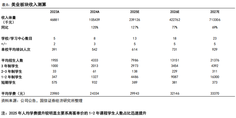 中国东方教育目前通过“欧曼谛”品牌布局美业赛道,培育进展显著,已逐步构建起初步的就业壁垒,年就业人数稳步提升,逐步扩大规模优势靠拢。根据公司披露信息,欧曼谛作为集团旗下现代化时尚美业教育品牌,开设形象设计、美妆、美容、美发、美甲等多元化专业课程,搭建了由国家技能人才智库专家、世界大赛评审委员及国际资深美业导师组成的高水准教学团队。2024年,欧曼谛平均培训人次0.4万人次,同比增长121%,按96%的引荐就业率测算,年就业人数约0.38万人。在2025年上半年,平均培训人数已达0.6万人,超过2024全年规模,仍在快速扩张。渠道拓展方面,公司美业板块在2025年已布局8所院校,目前体量相较其他专业仍较少,预计2026年仍有较明确的扩校计划,进而带动培训人次体量增长。