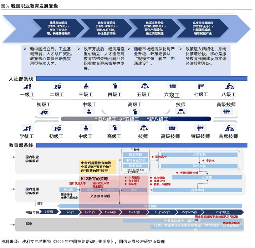 4)高质量发展阶段(2022年至今):对标教育强国与实体经济转型升级战略,政策精细化、系统化推进。2022年新《职业教育法》巩固职教类型地位,明确职普融通、产教融合法律要求,同年人社部印发《关于健全完善新时代技能人才职业技能等级制度的意见(试行)》确立新“八级工”制度框架,完善技能人才评价体系;2024年《教育强国建设规划纲要(2024-2035年)》将职教纳入教育强国核心布局;2025年聚焦重点领域启动专项技能提升行动,构建全链条培训就业服务体系,强化政策落地与产业赋能,推动职教行业高质量发展。