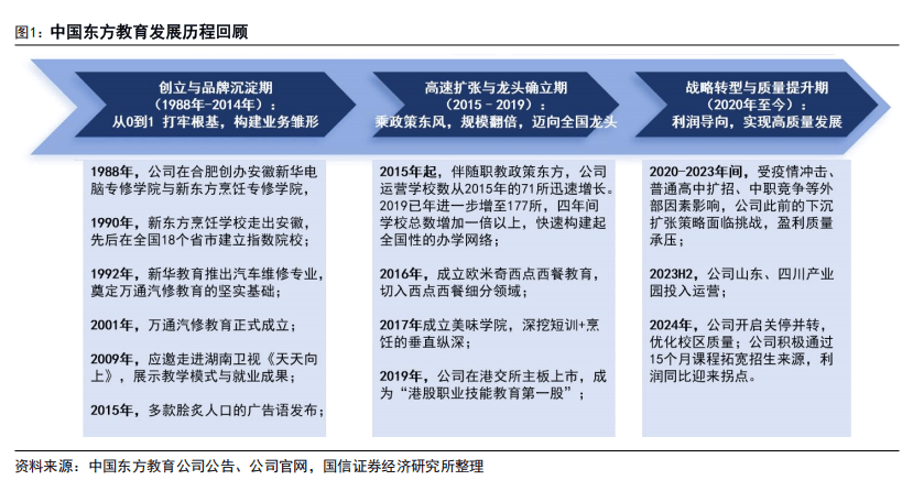 中国东方教育成立于1988年,总部位于安徽合肥,是国内领先的职业技能教育集团,2019年在香港联合交易所上市,成为“港股职业技能教育第一股”。公司专注于提供职业技能培训服务,业务覆盖烹饪技术、信息及互联网技术、汽车服务、时尚美业四大核心板块,旗下拥有新东方烹饪、欧米奇西点西餐、新华电脑、万通汽修、欧曼谛(美业)等多个知名品牌,形成了多元化、协同化的品牌矩阵。疫情间,公司经历了多因素导致的承压下滑,2024年公司积极调整,扩充生源、建设区域中心,迎来经营拐点,全年实现经调整归母净利润5.13亿元,同比+88%。另一方面,目前经调整归母净利润仅恢复至疫情前对应的65.5%(7.83亿元),后续仍有修复空间。