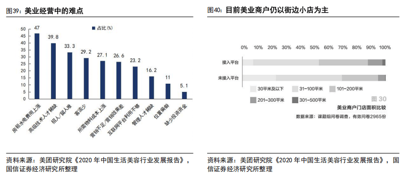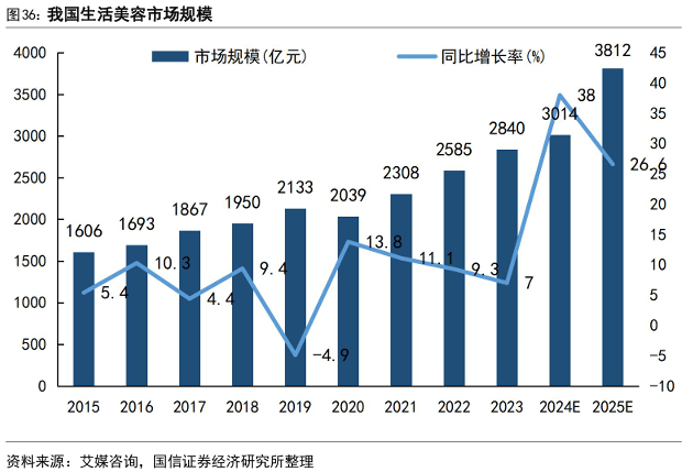 其一,情绪消费升级,预计生活美容市场规模于2025年已达3800亿元。近年来,居民消费需求从“基础实用型”向“情绪满足型”转型,美业已不再是单纯的“颜值提升”需求,更成为居民舒缓压力、愉悦心情、实现自我表达的重要方式,涵盖美妆、护肤、养生美容等多个场景,甚至融入运动后、熬夜后等日常生活场景,通过情感连接实现消费频次提升。这种情绪消费升级推动美业需求持续扩容。据艾媒咨询报告《2024年中国生活美容及轻医美市场研究报告》,2020-2023中国生活美容市场规模由约2039亿元稳步增长至近2840亿元,并预计在2025年逐步达到3812亿元市场体量;