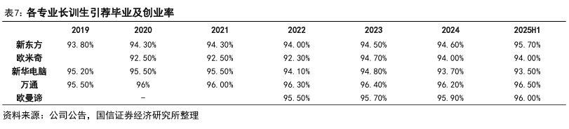 长学制招生特性使得公司收入变化相对滞后于新招生人数变化,伴随疫情及关停并转对招生的影响逐步出清,公司收入增速有望继续修复。公司商业模式及会计准则确认收入方式决定了不同学制招生对公司的收入产生的影响不同。例如2025年6月30日招生的一年制课程学生,将有50%的收入确认在2025年,50%的收入确认在2026年。基于此公司2025年三年制课程收入,最早可追溯到2022H2招生影响。2025H1,公司新培训人数同比增长7.1%,但平均培训人次仅同比增长5.5%,二者存在差值反映仍受此前负面因素影响。假设后续公司新招生人数增速维持稳定,则平均培训人次增速有望逐渐提速,进而带动收入同比提速。