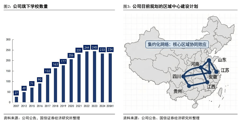 这一阶段,公司关停并转盈利能力较弱的校区,优化学校布局,2024年中报披露学校数为234所,较2023年底减少11所,但收入仍实现温和增长,体现出“提质增效”的显著成效;同时,优化招生与学制结构,压缩低客单价短期课程及获客成本较高的综合三年制课程,提升1-2年制高价值长训课程比例,拉动人均学费增长;此外,加速推进区域中心战略,从地县级下沉扩校转向在生源大省建设七大区域中心,实现资源集中配置,提升规模效应与成本摊薄效率。截至目前,公司已完成从“规模驱动”向“质量与利润双驱动”的转型,盈利水平持续修复,进入利润率快速修复的发展阶段。