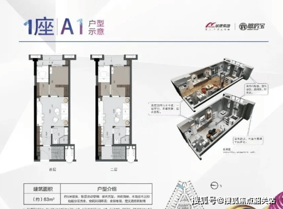 1. 57㎡复式一居室:该户型为紧凑实用型户型,布局方正,南北通透,采光通风优良。一层规划为客厅、餐厅、厨房、阳台,客厅宽敞明亮,连接阳台,可享受充足的阳光和良好的视野;厨房紧邻餐厅,动线合理,方便烹饪和用餐;阳台宽敞,可用于晾晒、休闲,实用性强。二层规划为卧室和卫生间,卧室宽敞舒适,采光充足,卫生间干湿分离,设计科学合理,保障居住私密性。该户型适合单身人士、年轻情侣自住,或作为小型办公场所,空间灵活,性价比突出。